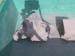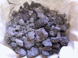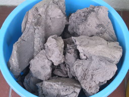 上の採掘現場より 採掘され、乾燥をした、 香登の原土です。 この塊が一番下の形になるまで ハンマーを振り続けます。 |