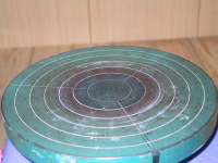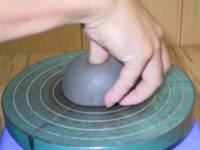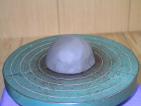 粘土の塊を手回しロクロの中心に置く。 |