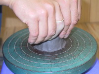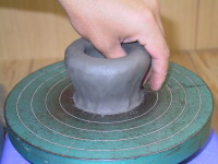 粘土の塊をロクロ中心に制作物の高台サイズで 回しながら包み込むように確りと固定していきます。 |