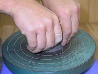 表面のヒビなどで気になるところは添え手を内側にして 指のお腹で軽く擦って修正をしていきます。 |