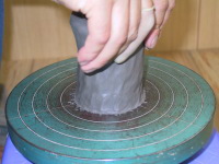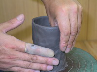 この手法で少しづつ粘土を摘んで寄せていけば、 肉厚が薄くなりながら下部から上部へと粘土が 引き上げられていきます。 ロクロが最低一周するまでは、手の位置を変えずに 同じ高さと、場所で指先に神経を集中して、 ロクロ同円心状の同じ外周の位置で摘んで寄せて 下部から指先で感じながら一定の厚みの粘土と位置を 少しづつ上部に手を移動しながら引き上げていきます。 上部の口元まで同じ厚みを保って引き上げてください。 そこで、口元の高さを一度補正します。 |