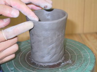 底部より側面の立上りの際から、 今度は両手の親指と人差し指・中指を使って 耳たぶの摘んだ厚みを感じながらツボを揉むように 摘んでいきます。 ロクロが最低一周するまでは、手の位置を変えずに 同じ高さと、場所で指先に神経を集中して、 厚みを感じられるところは摘んで、そうでないところは そのままで、同じ外周の厚みとロクロ同円心状の位置で一定にしていきます。 基本的には側面を底部分から順次、上部にまで 耳たぶの厚みで引き上げていきます。 |